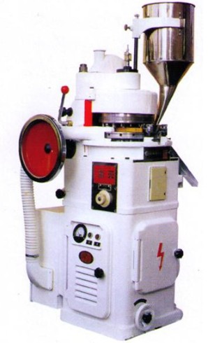 扭轉式壓片機首要為上沖、中模、下沖三個局部連成一體,四周19付沖模平均擺列在轉盤的邊緣上、高低沖桿的尾部嵌在牢固的曲線導軌上,當轉盤作扭轉的活動時,高低沖即跟著曲線軌導作起落活動而到達壓片目標。